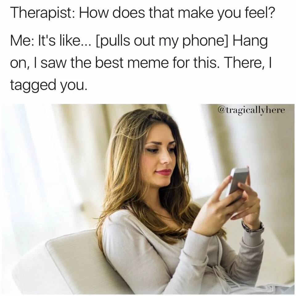 I'm not sure if it's a generational thing or if it's due to being in an era where the Internet governs our lives, but not only do my young(ish) clients refer to how they feel using memes, but I relate back with memes too. It is a great way to connect, accurately describe your feelings, enhance my understanding, and adds a little humour to the session. By the way, clients don't actually tag me in memes.